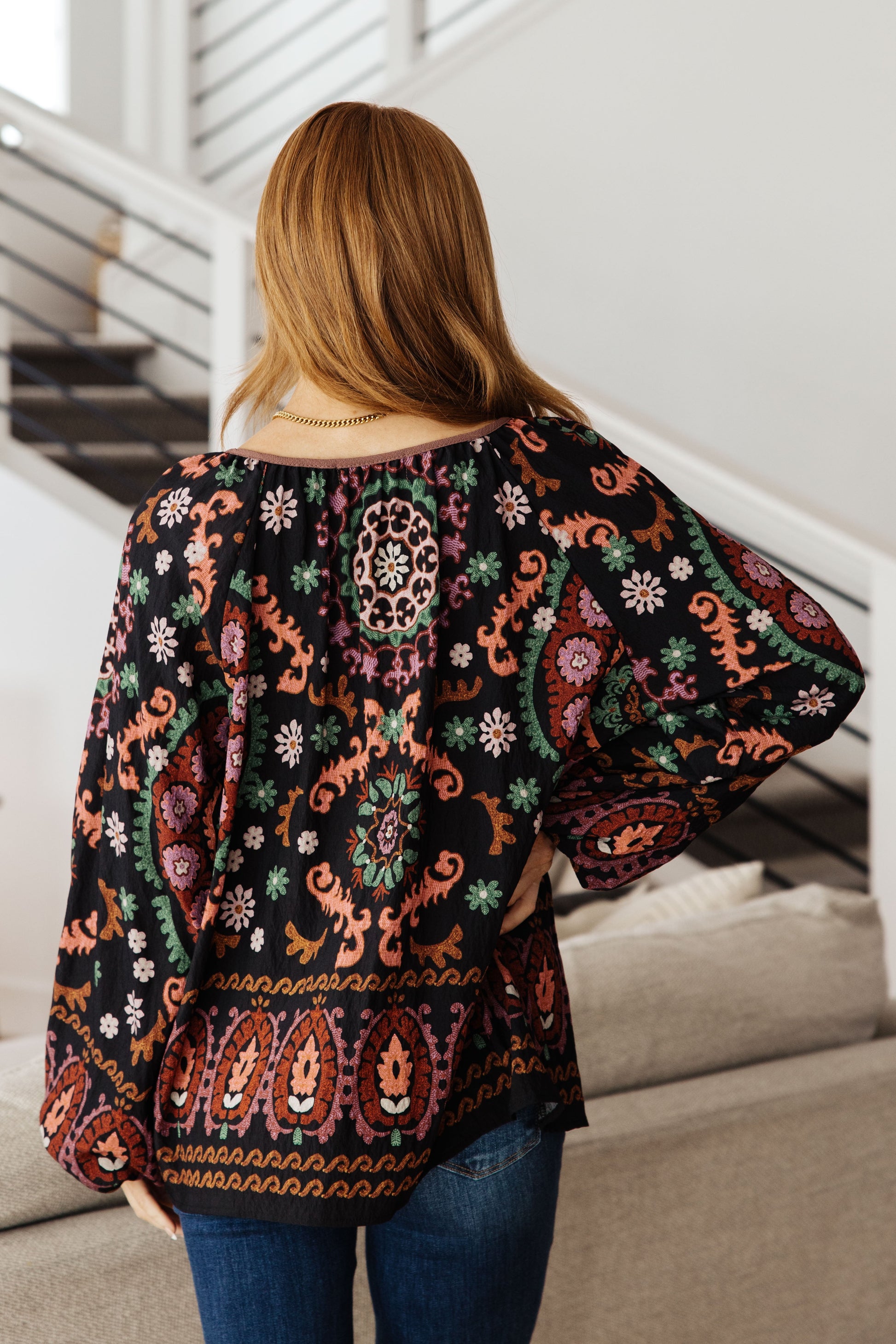 Be daring and vibrant with this I Feel That Peasant Blouse. This gorgeous blouse is beautifully textured with a woven fabric, features a tie-neck keyhole, and is accented with a vibrant boho border print in rich colors. Stand out and show off your unique style!