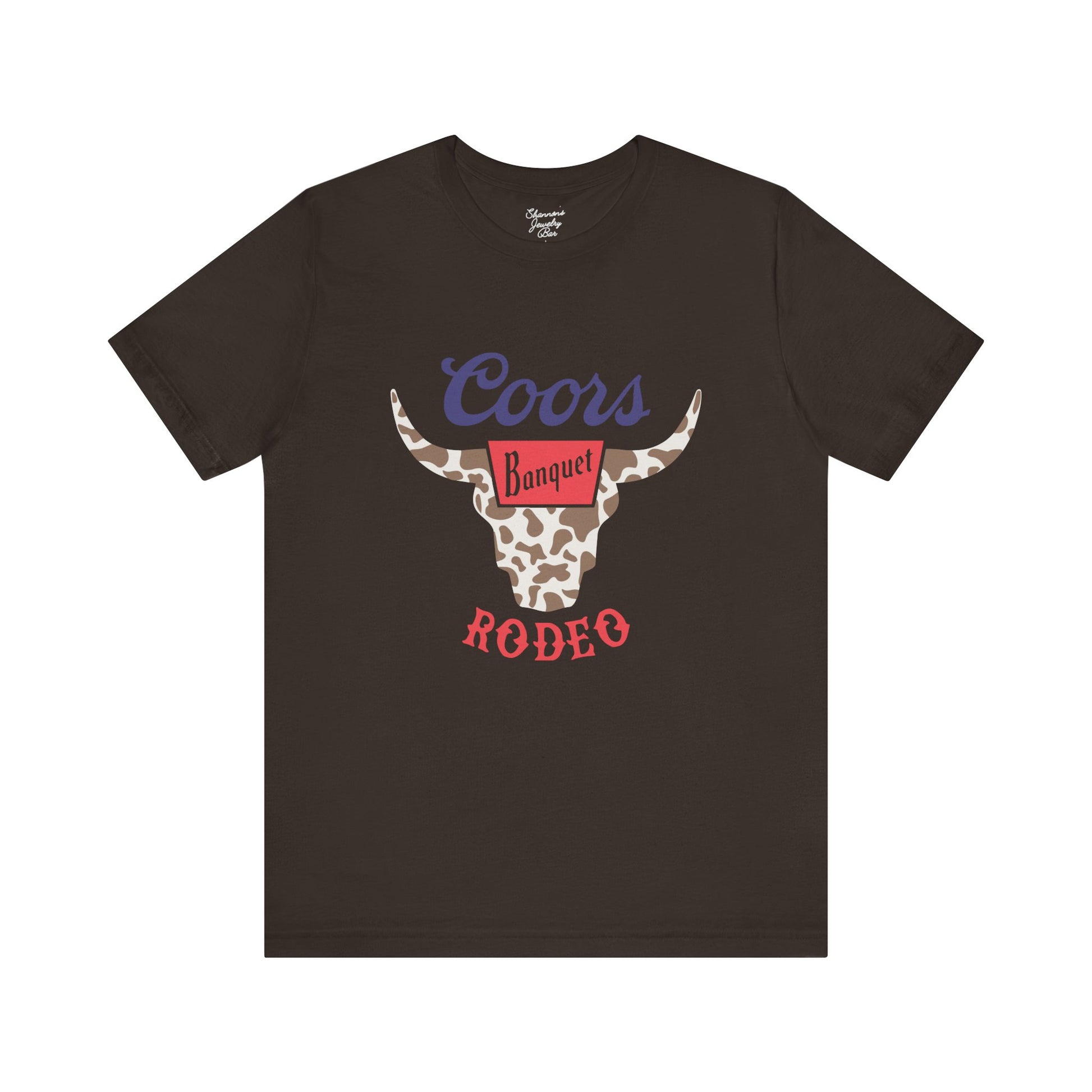 Rodeo Coors Cow Skull with Cow Print- Unisex Jersey Short Sleeve Tee